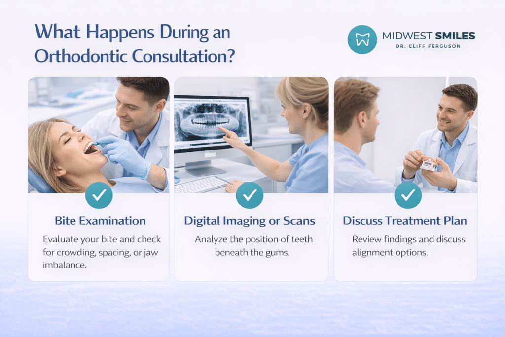 An orthodontic consultation typically begins with a detailed bite examination. The dental professional evaluates how the upper and lower teeth come together and checks for signs of crowding, spacing, or jaw imbalance.