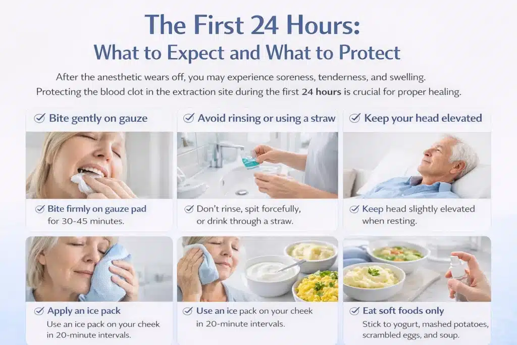 The first 24 hours are also the most critical for clot formation. A blood clot forming in the socket marks the beginning of healing – it protects the bone and nerve endings beneath. Protecting that clot means: