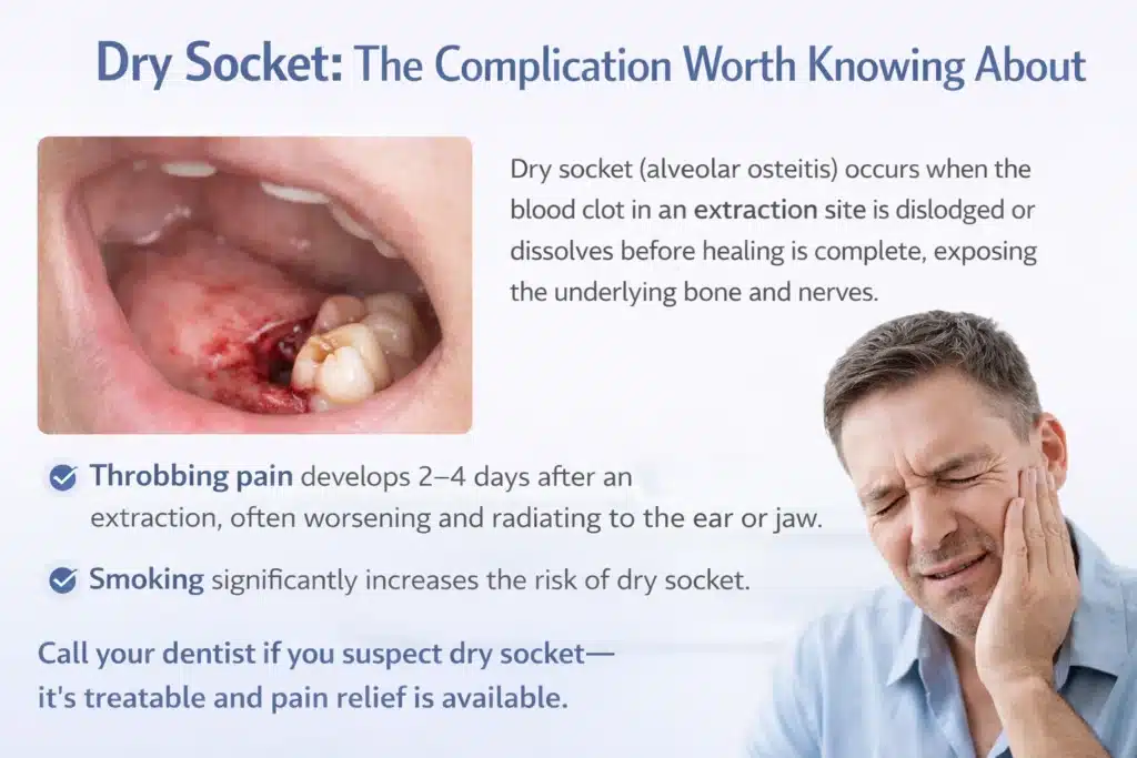 The common sign is a sharp, throbbing pain that begins 2 to 4 days after the procedure. The pain worsens rather than improving, often radiating to the ear or jaw. If that describes what you’re experiencing, call your dental office right away. Dry socket is treatable: the dentist will clean the socket, place a medicated dressing that provides near-immediate pain relief, and guide you through the remaining healing process.